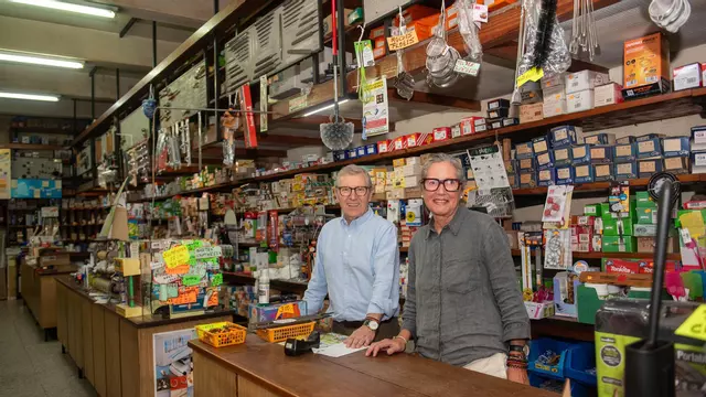 Manuel Mosquera e a súa muller, María, tras ou mostrador dá Ferraxería 4 Camiños / Casteleiro/Roller Axencia