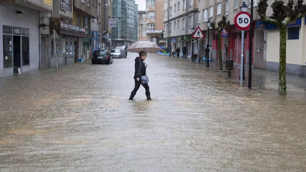 Unha rúa alagada no centro de Sada. / Casteleiro